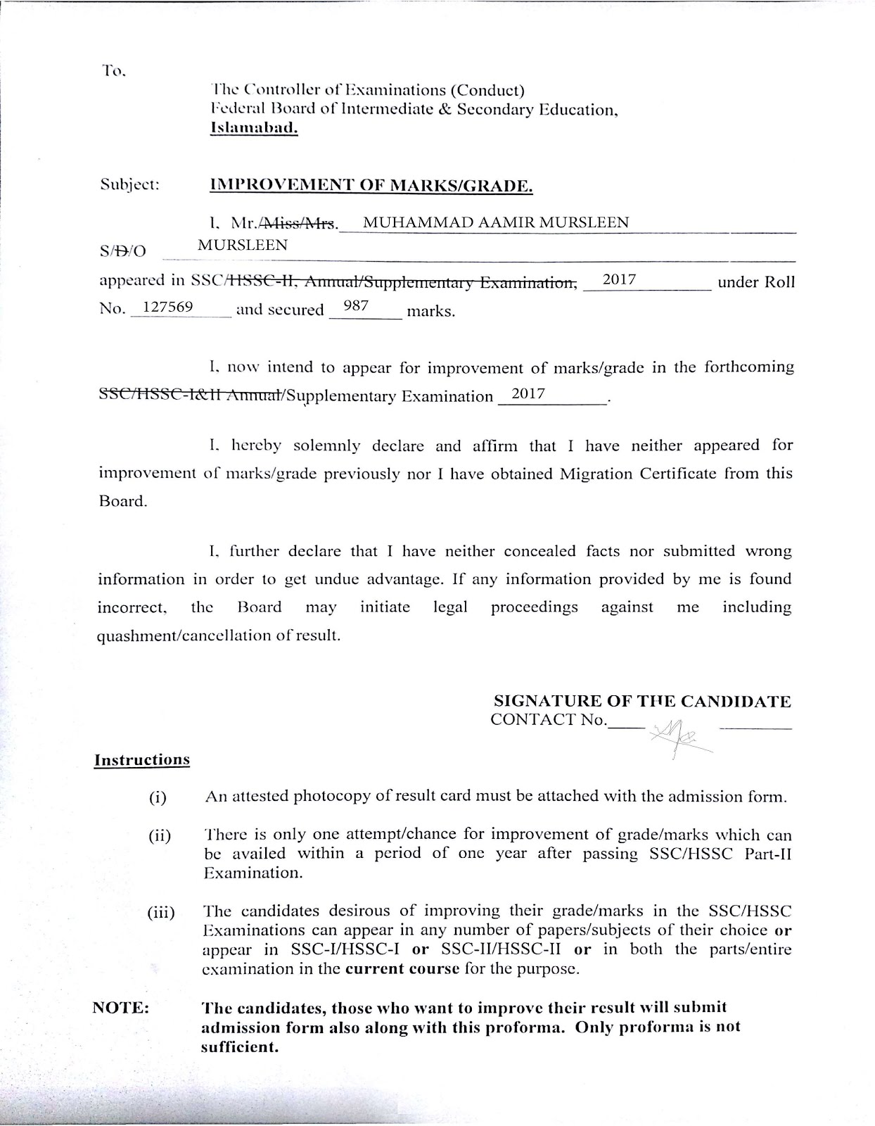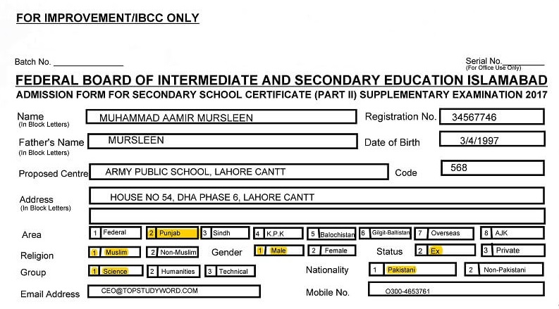 Go to the official website of FBISE, and click Admission Form for SSC Part-II Supplementary Examination 2017 for (Improvement Only) and download and open the PDF.Hint: