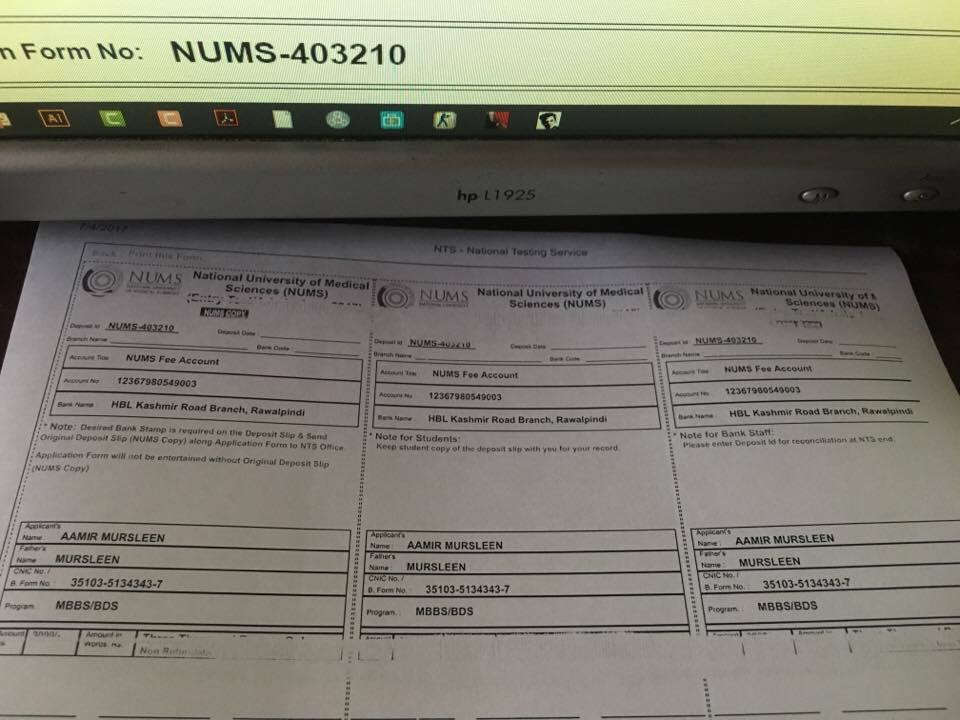 - After successful submission of application form, Deposit Slip and Application Form will appear. Print both, and deposit the prescribed fee in any country-wide online branch of Habib Bank Ltd. (HBL) and send the Original paid copy (NUMS Copy) along with the printed Application Form to: