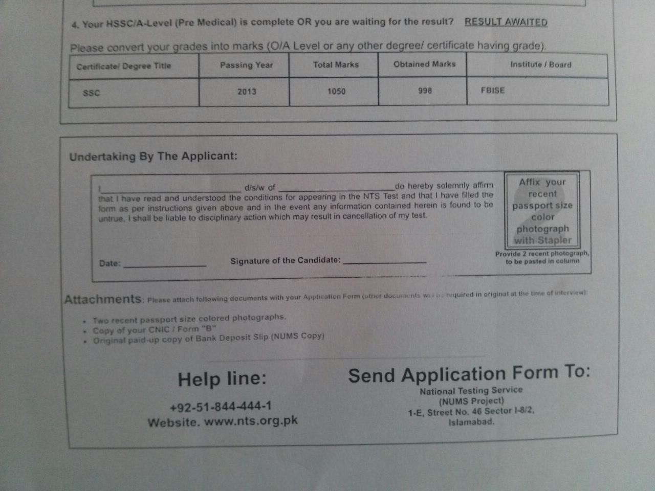 - Please send the application form with the original deposit slip (NUMS Copy), two passport size photograph and copy of CNIC / Form "B" to the address given below latest by " Monday, 31st July 2017."
