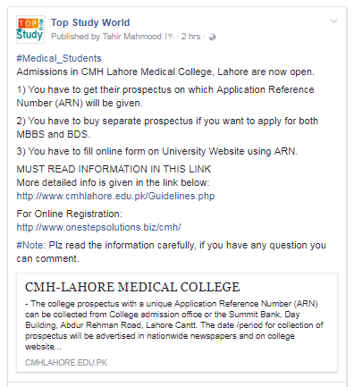 - For Army Medical College, Rawalpindi: Admissions process for Army Medical College will start after the declaration of NUMS Entry Test Result.