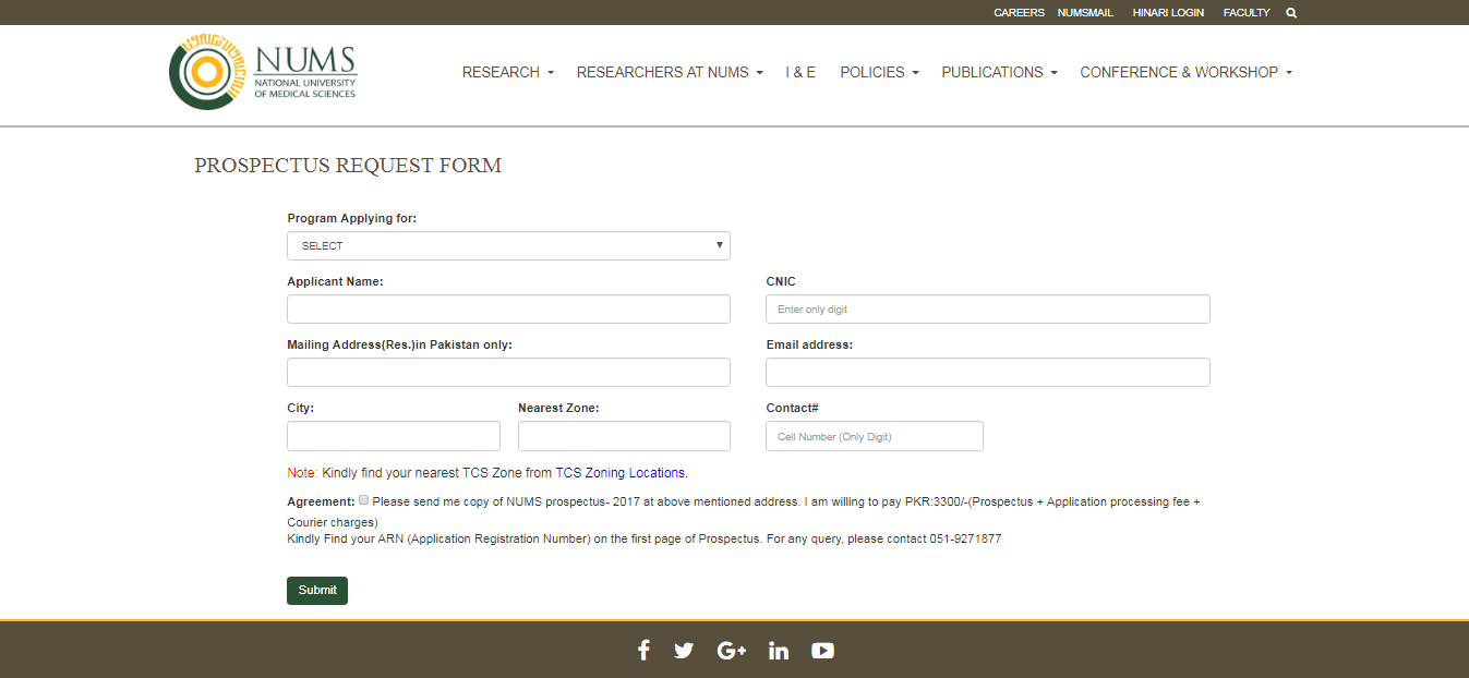 - Prospectus including sample applications forms will be available online as well as at Admissions Office NUMS, Military Hospital, Rawalpindi Cantt.
