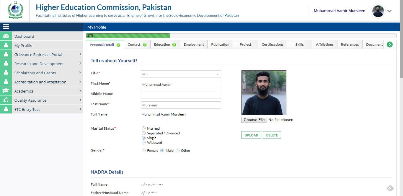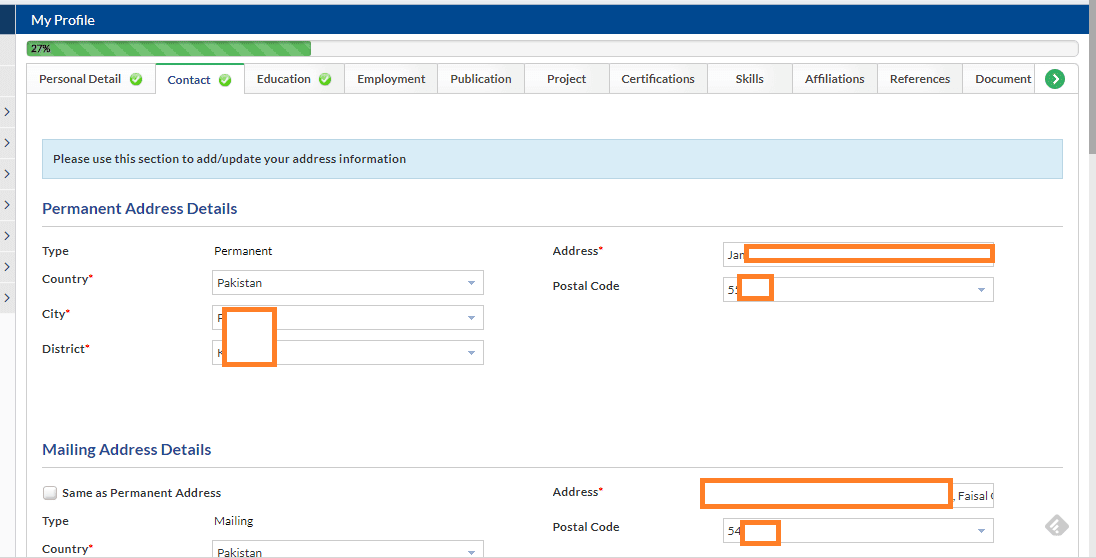 Now go to My Profile, and complete the information of Personal Detail, Contact, and Education. You don't need to complete the information for other things like Publications etc.