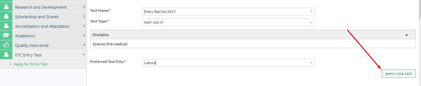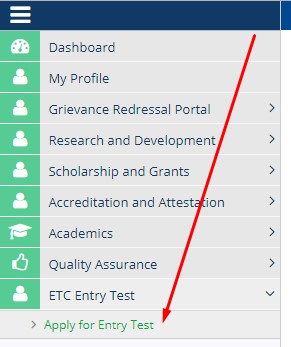 Click on ETC Entry Test then Apply for Entry Test.