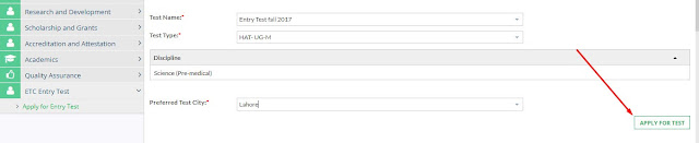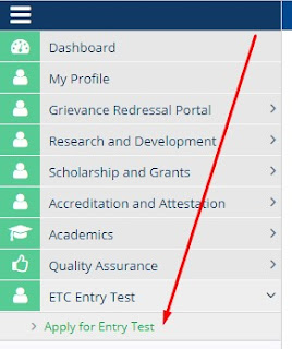 Click on ETC Entry Test then Apply for Entry Test.