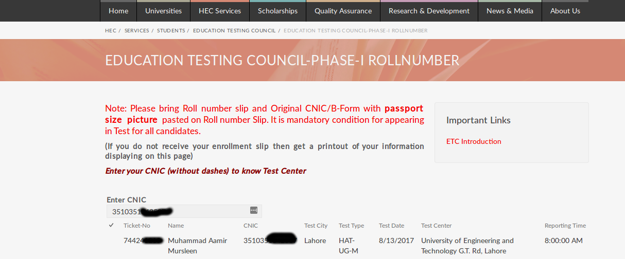 Thanks to HEC, an official solution has been made public where students can write their CNIC number or B-Form number to see the roll number slip and take the exams without any problems for print out in a hard copy.