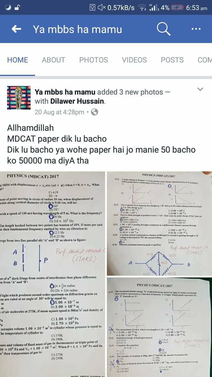 The pictures of solved Physics’ MCQs were circulating on Social Media with this tag: “Sold this paper to 50 students in 50,000 rupees.”