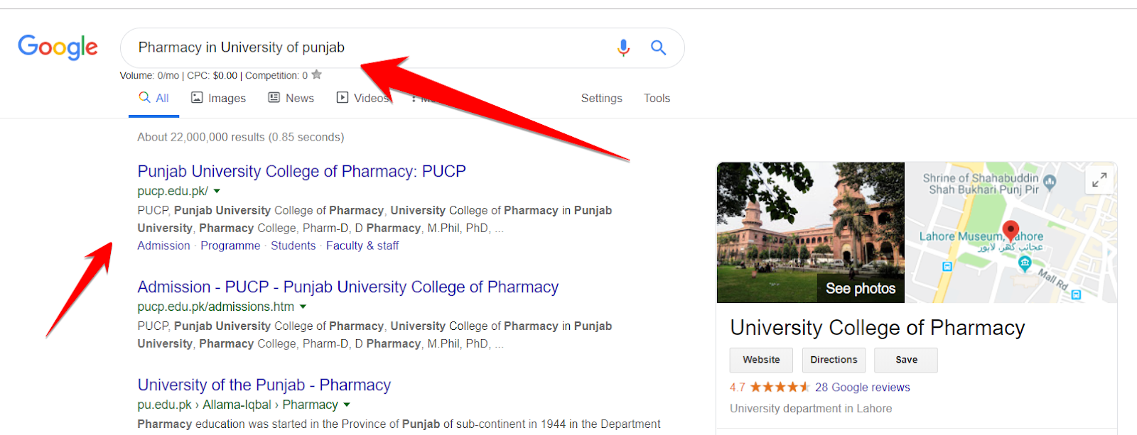 In order to find the Pharmacy department of any university, just type Pharmacy + university name like