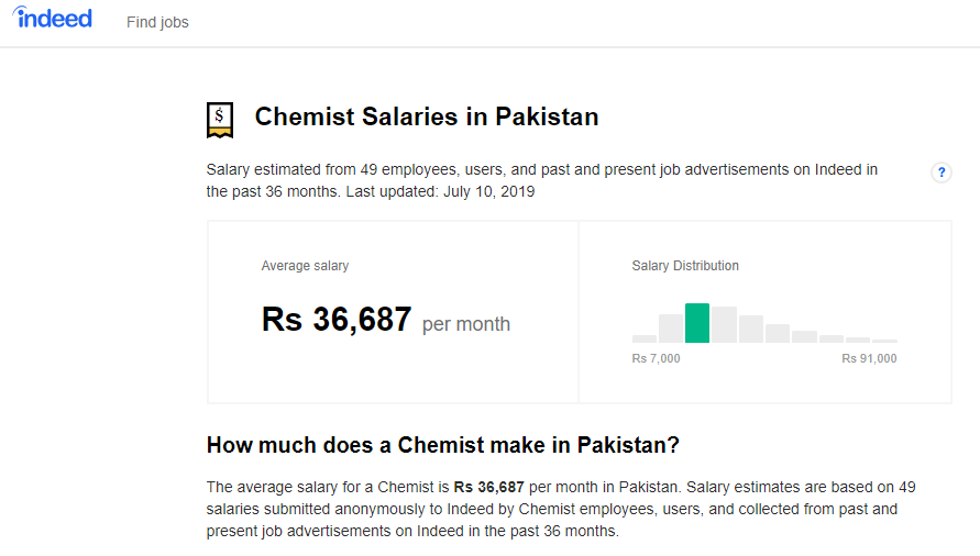 The average Chemist salary in Pakistan is PKR 440,244 per year or PKR 36,000 per month. Entry level positions start at PKR 26,000 per month while most experienced workers make up to PKR 130,000 per month.