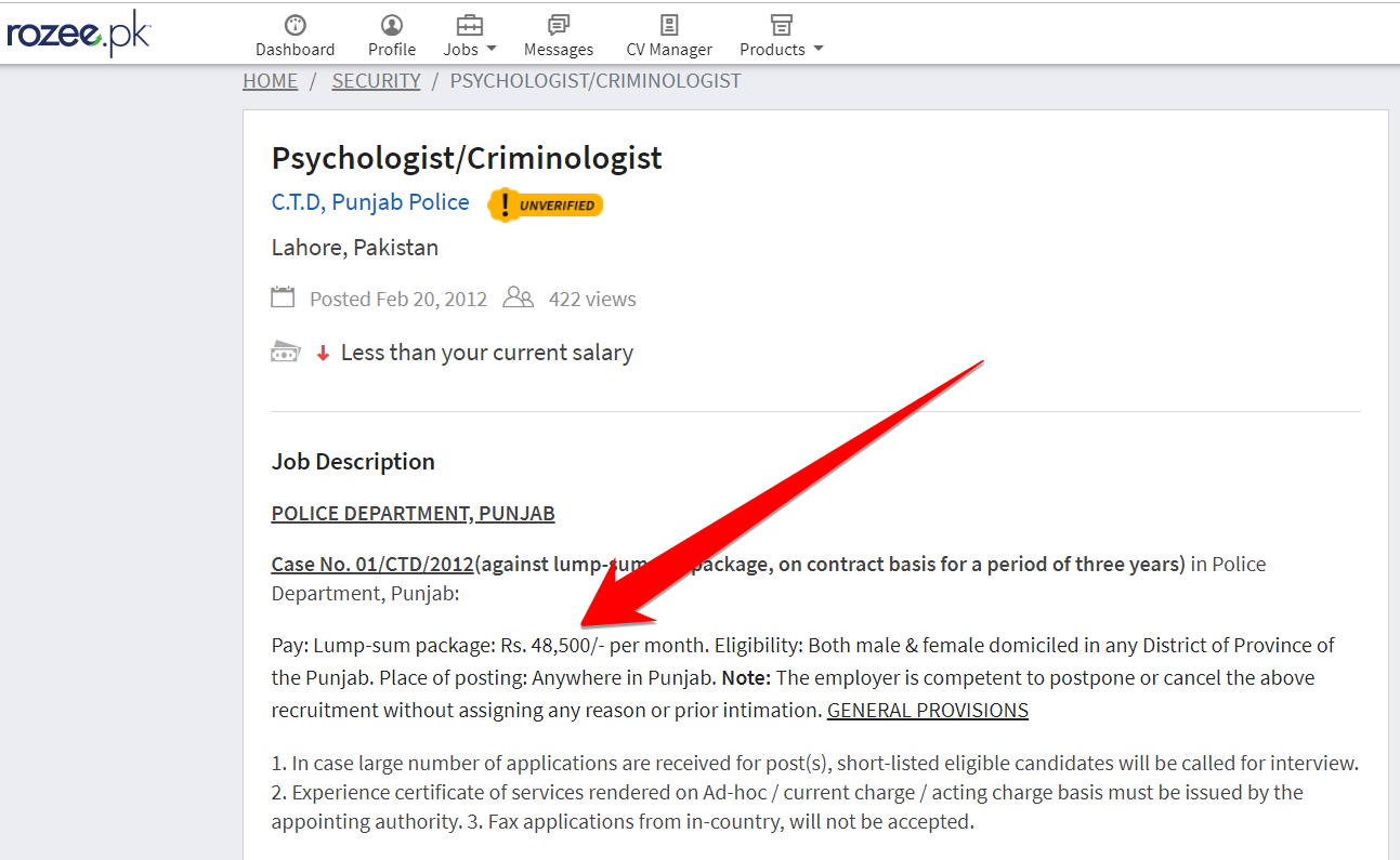 The average salary of a Criminologist in Pakistan is between Rs. 26,000 to Rs. 48,000 depending on the department being hired. In Punjab Police, a fresh Criminologist is employed for Rs. 48,500 per month without any expericne.