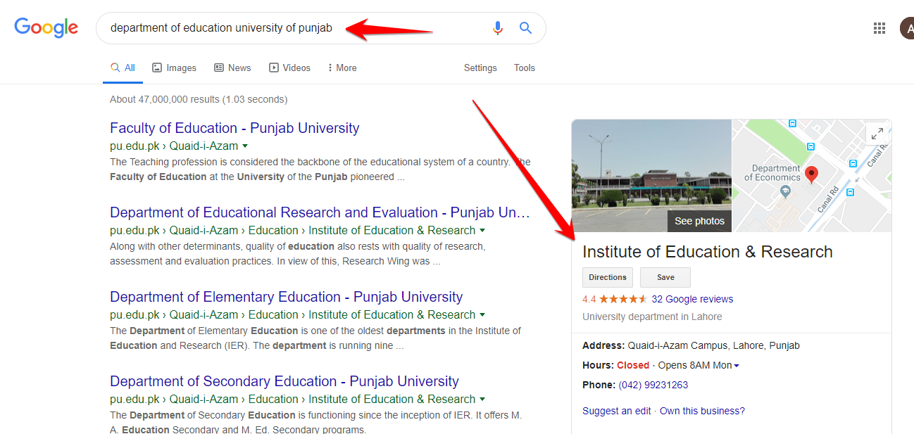 To find the department of Education in any university, just type Education + university name like