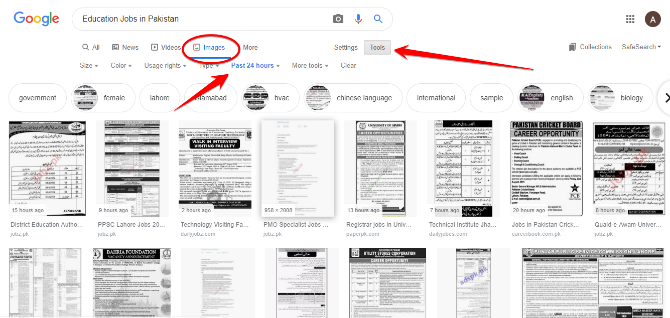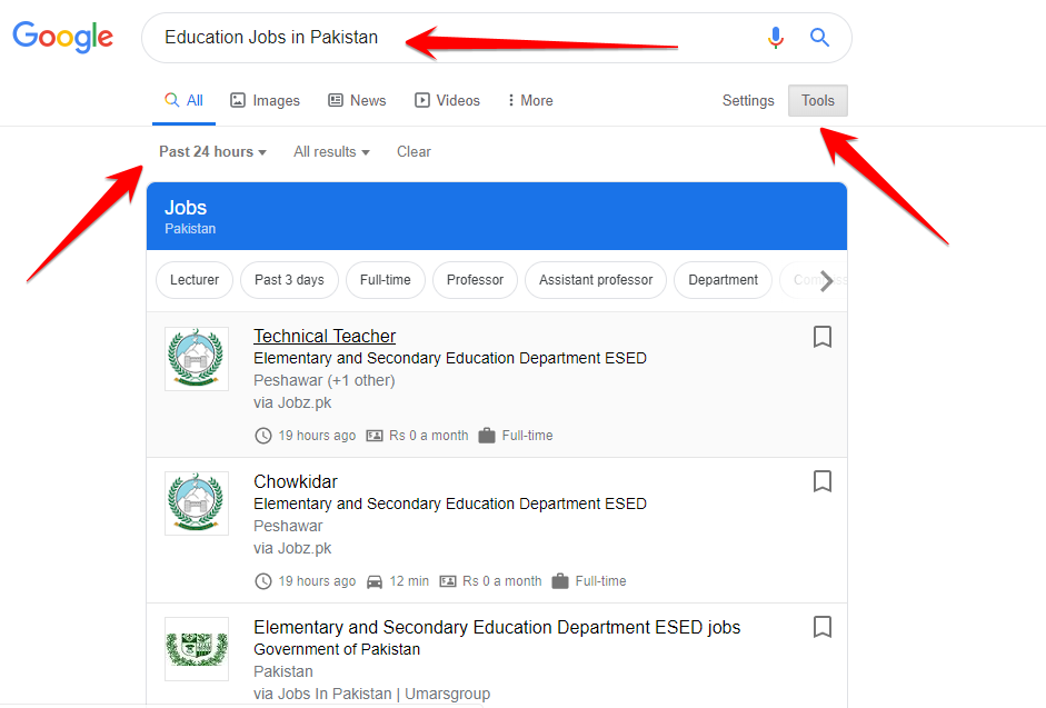 When you type Education's jobs in Pakistan, you can also write your city name instead of Pakistan to find the jobs.