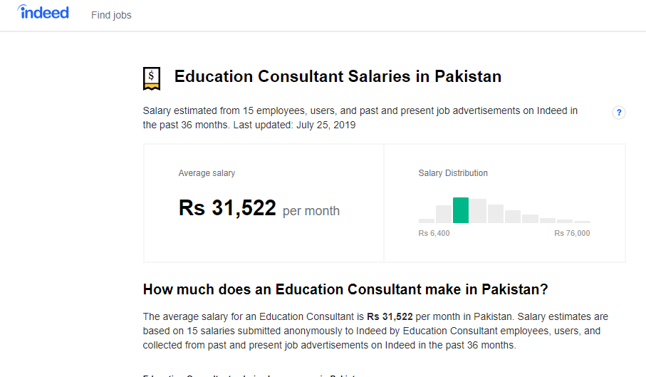 The average Educational Researcher salary in Pakistan is PKR 378,264 per year or PKR 31,522 per month. Entry level positions start at PKR 26,000 per month while most experienced workers make up to PKR 80,000 per month.