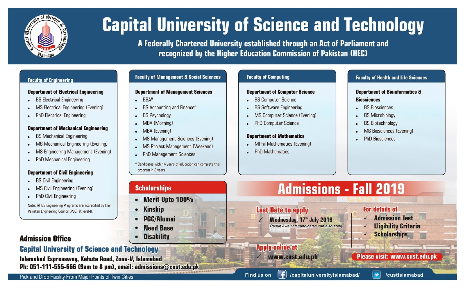 Capital University of Science and Technology (CUST) is a private university situated at Kahuta Road, Sihala, Islamabad.