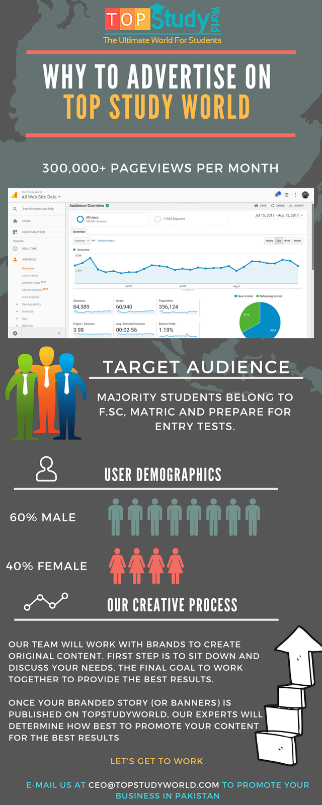 Advertise with Top Study World with more than 300,000+ page views per month, and let your brand platform to build your brands and grow your business. Let’s tell great stories together to the students of Pakistan.